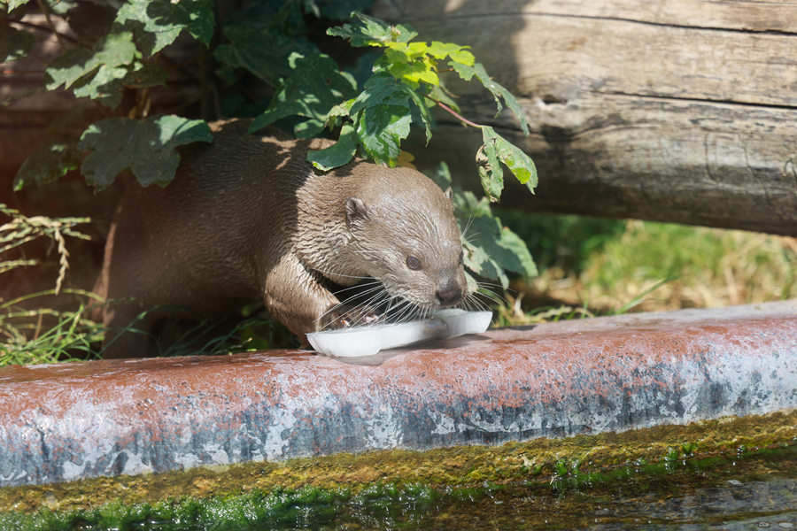 7月18日,在比利時布呂熱萊特市天堂動物園,一只水獺舔舐冰塊。