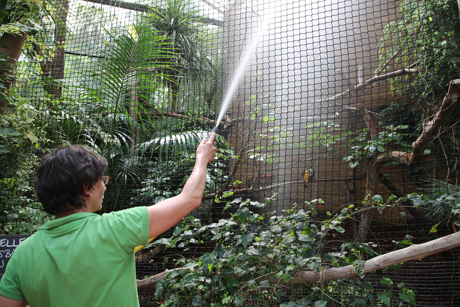 7月18日,在比利時布呂熱萊特市天堂動物園,工作人員使用噴水裝置為巨嘴鳥降溫。