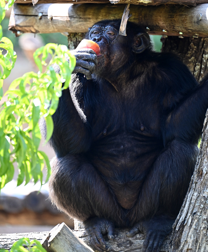 7月19日,在意大利羅馬動物園,一只黑猩猩吃水果冰棍消暑。