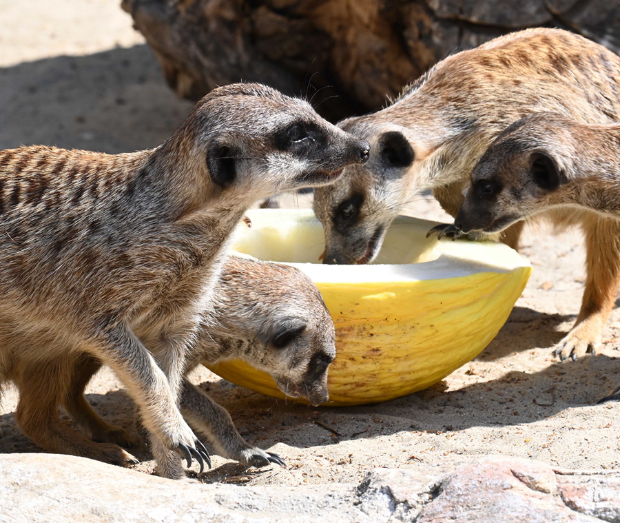 7月19日,在意大利羅馬動物園,貓鼬吃冰鎮蜜瓜消暑。