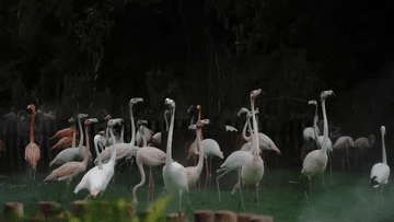 7月15日,上海野生動物園的火烈鳥享受噴霧降溫。