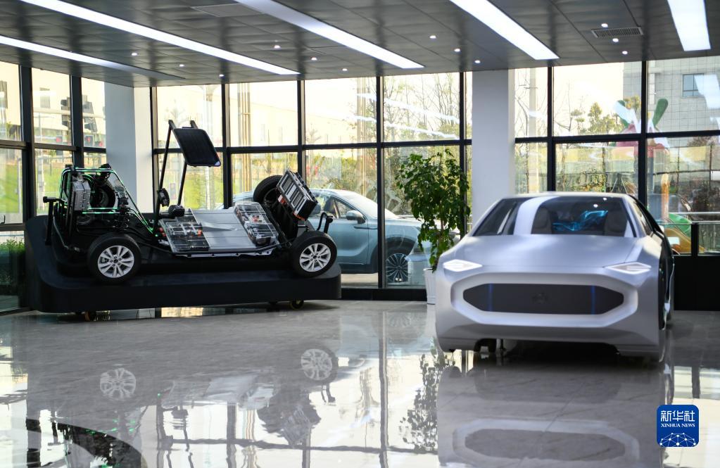 在四川省廣安市鄰水縣川渝高竹新區一家企業展廳內拍攝的展車(2021年3月24日攝)。新華社記者 王曦 攝