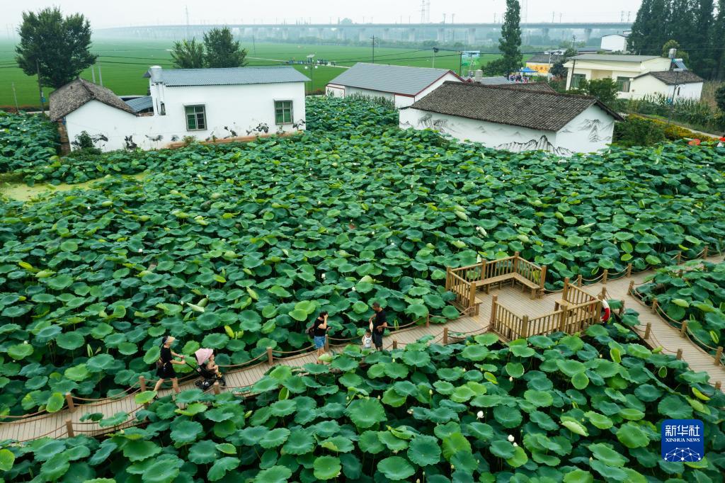人們在四川省眉山市東坡區太和鎮永豐村欣賞荷塘美景,荷塘旁邊就是村里處理生活污水所用的埋于地下的污水收集池、沉渣池、四級厭氧池等(2022年6月22日攝)。新華社記者 沈伯韓 攝