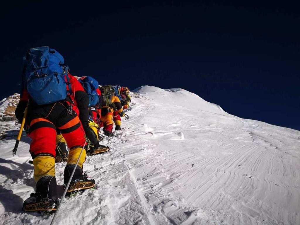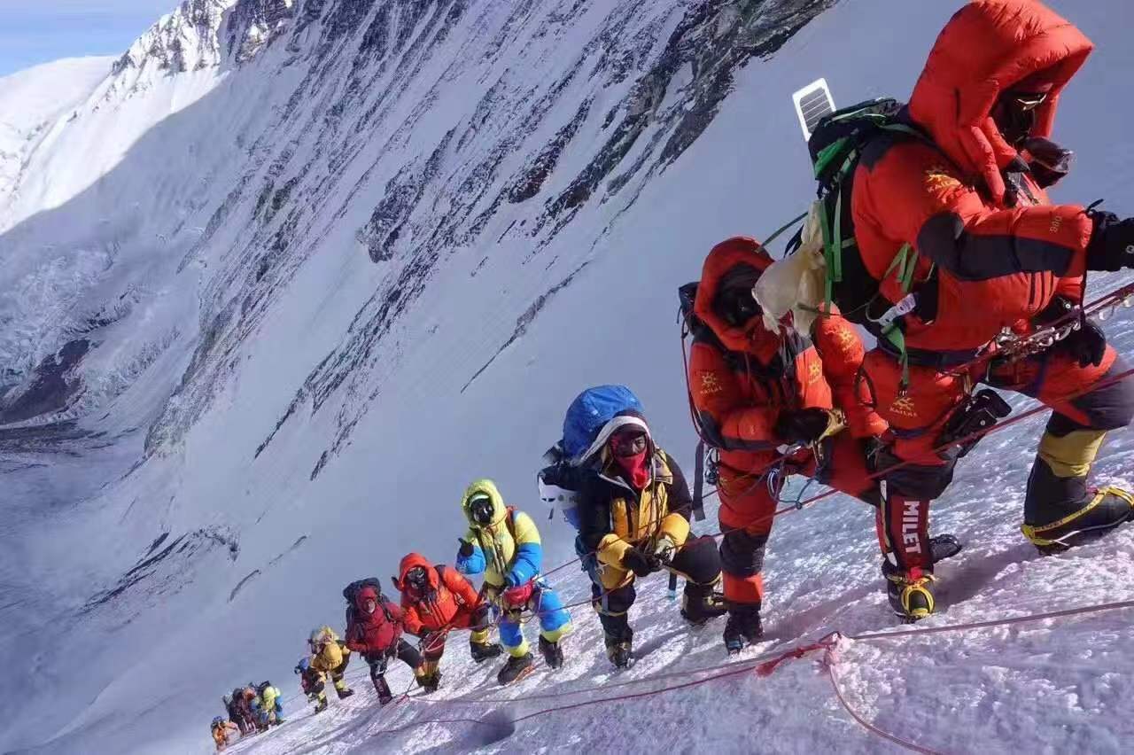 資料圖片:這是2008年5月27日,登山隊員通過架設在海拔8700米左右的珠峰第二臺階的“中國梯”向上攀登,第二臺階是一段一道高數米、幾乎垂直的巖壁,極難尋找攀爬支撐點,必須借助金屬梯才能通過。