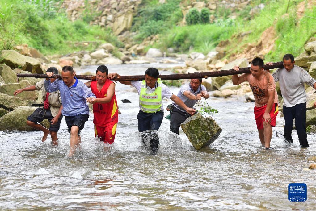 在位于黔桂交界大苗山深處的烏英苗寨,駐村第一書記韋桂華(右四)、黨員梁成兵(右三)、梁志新(左二)帶領村民維修河堤(2019年6月30日攝)。新華社記者 黃孝邦 攝