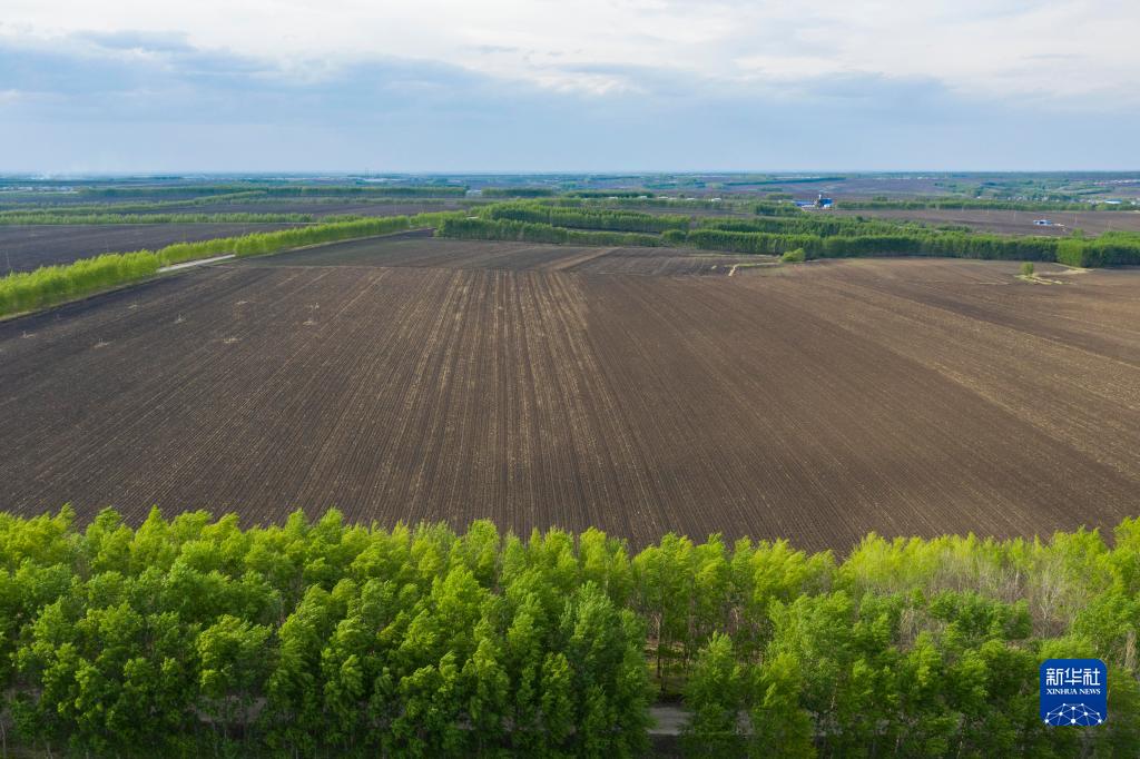 黑龍江省海倫市前進鎮光榮村已完成播種的黑土耕地(2022年5月23日攝,無人機照片)。新華社記者 謝劍飛 攝