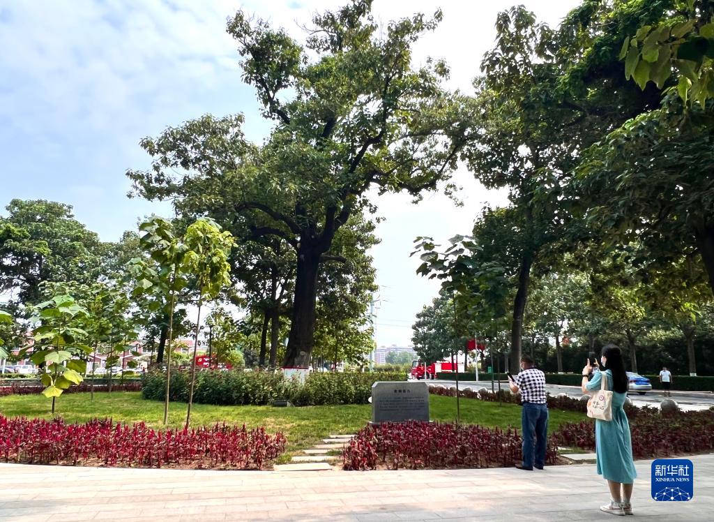 在河南省蘭考縣焦裕祿干部學院門口,人們在“焦桐”下參觀(2022年8月15日攝)。新華社記者 郝源 攝