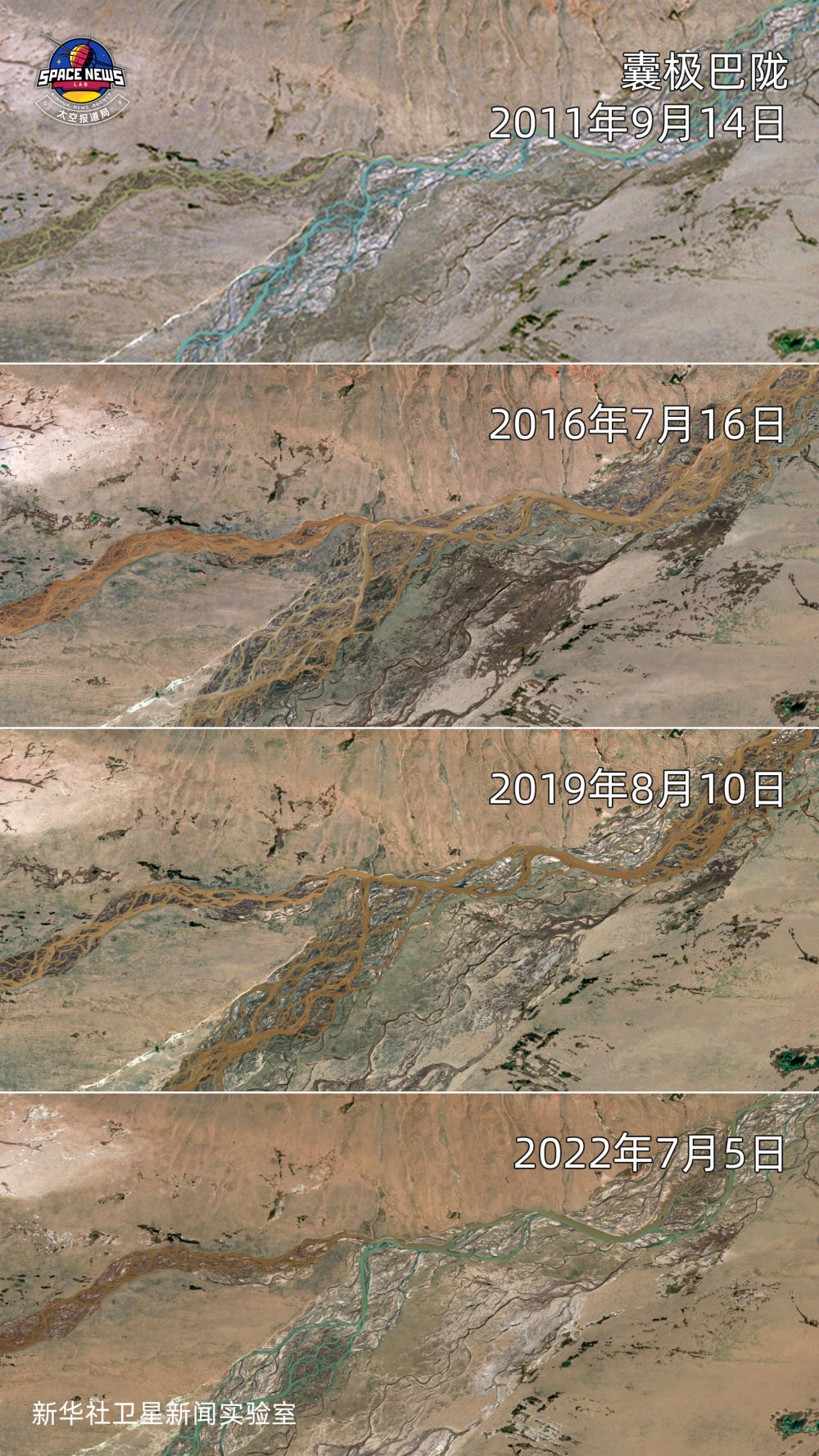 在長江正源沱沱河和南源當曲匯合的囊極巴隴,不同時期的衛星圖像清晰顯示,江源水系河道沖淤頻繁,水流不斷分汊又匯集,鳥瞰就像在大地上扎起許多小辮子。