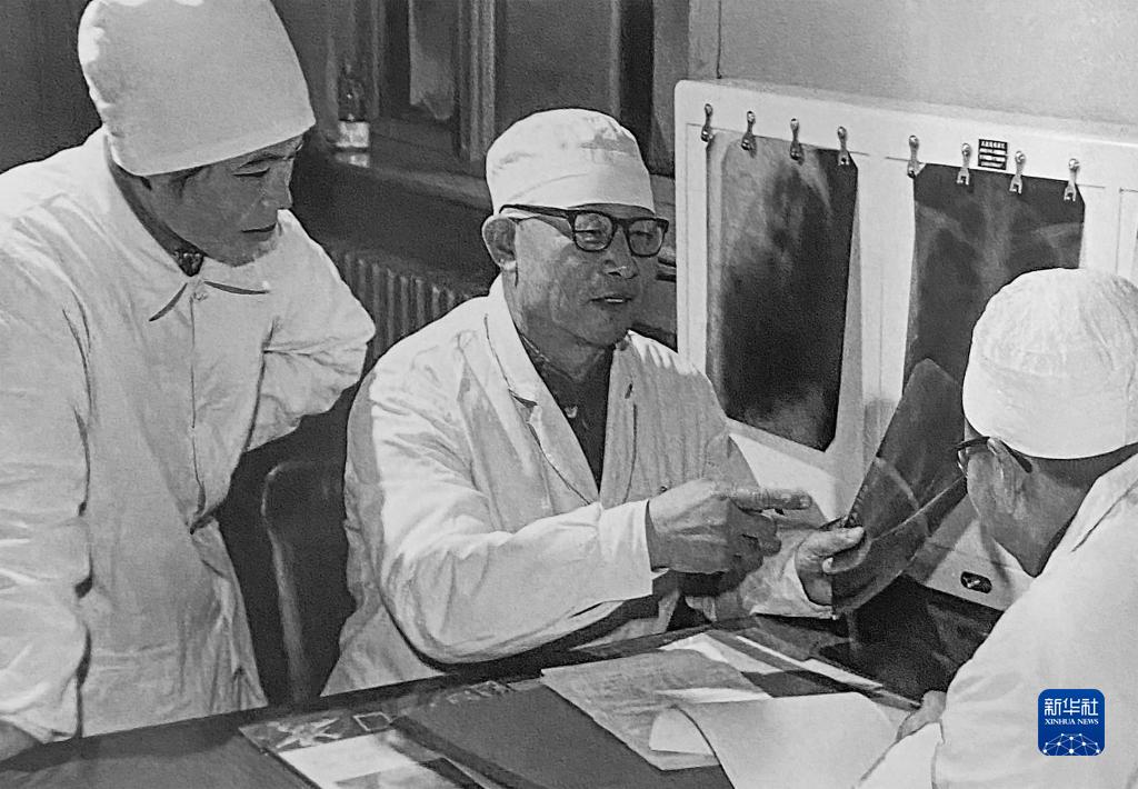 1980年1月16日,辛育齡(中)在內蒙古結核病院與胸外科醫師討論病例(翻拍照片)。新華社發