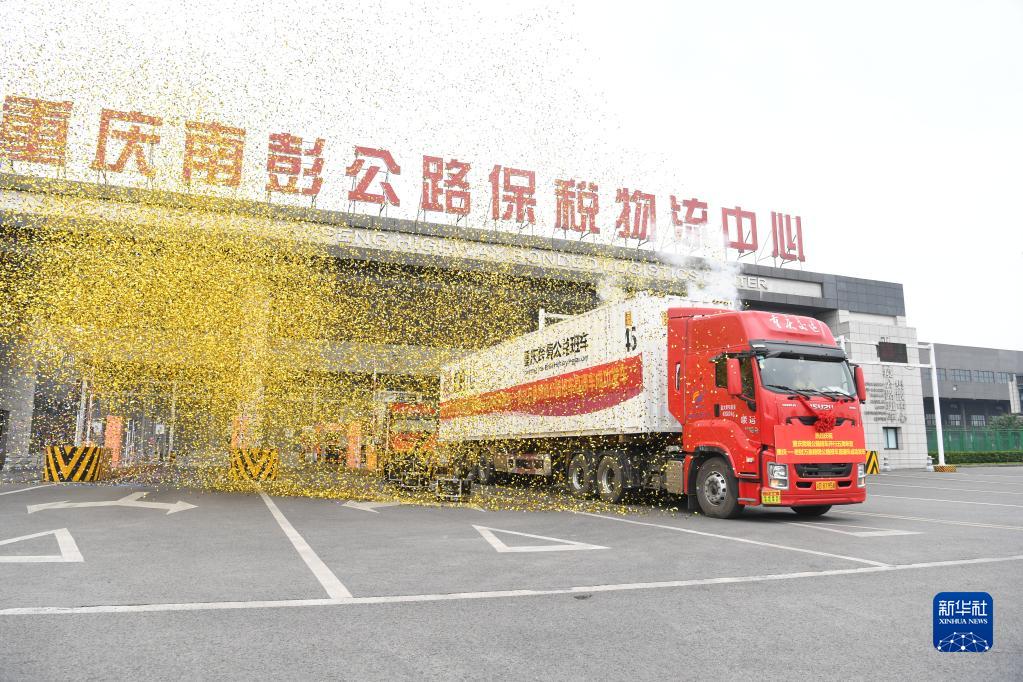 重慶至老撾萬象跨境公路班車直通車從重慶南彭公路保稅物流中心駛出(2021年4月28日攝)。新華社記者 唐奕 攝