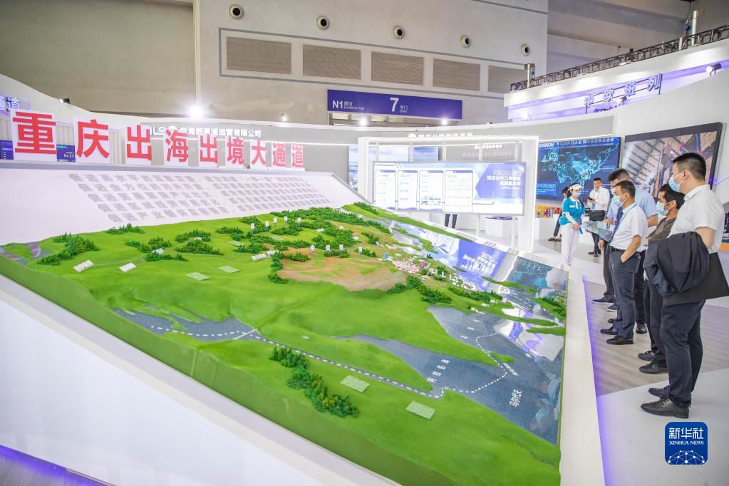 觀眾在第三屆中國西部國際投資貿易洽談會上參觀重慶出海出境大通道沙盤(2021年5月21日攝)。新華社記者 黃偉 攝