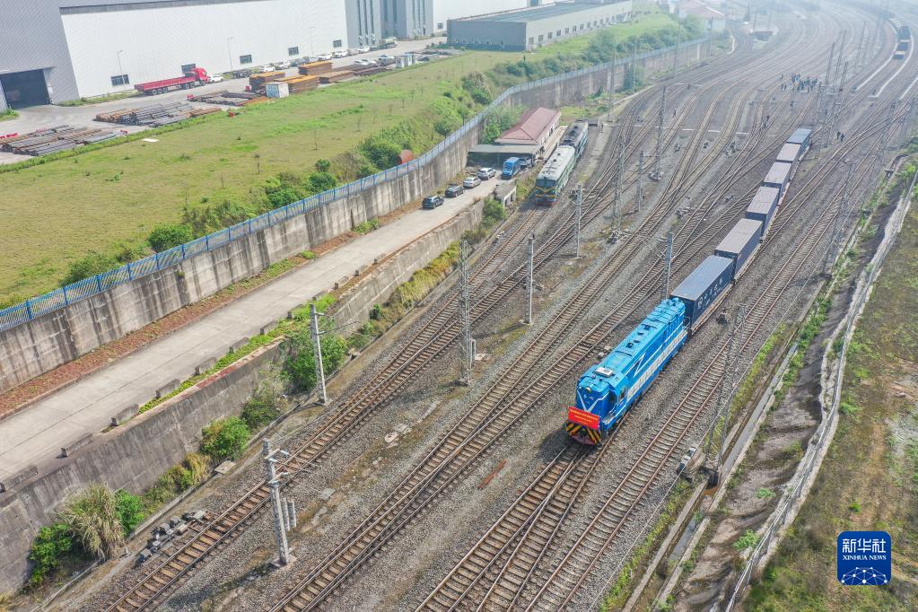 中緬新通道(重慶—臨滄—緬甸)國際鐵路班列從重慶果園港魚嘴車站順利發車(無人機照片,2022年5月23日攝)。新華社記者 唐奕 攝