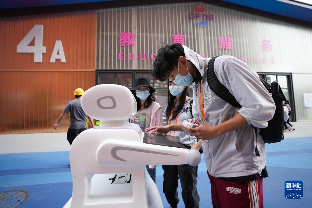 8月29日,工作人員在服貿會首鋼園區調試智能導覽交互機器人。新華社記者 鞠煥宗 攝