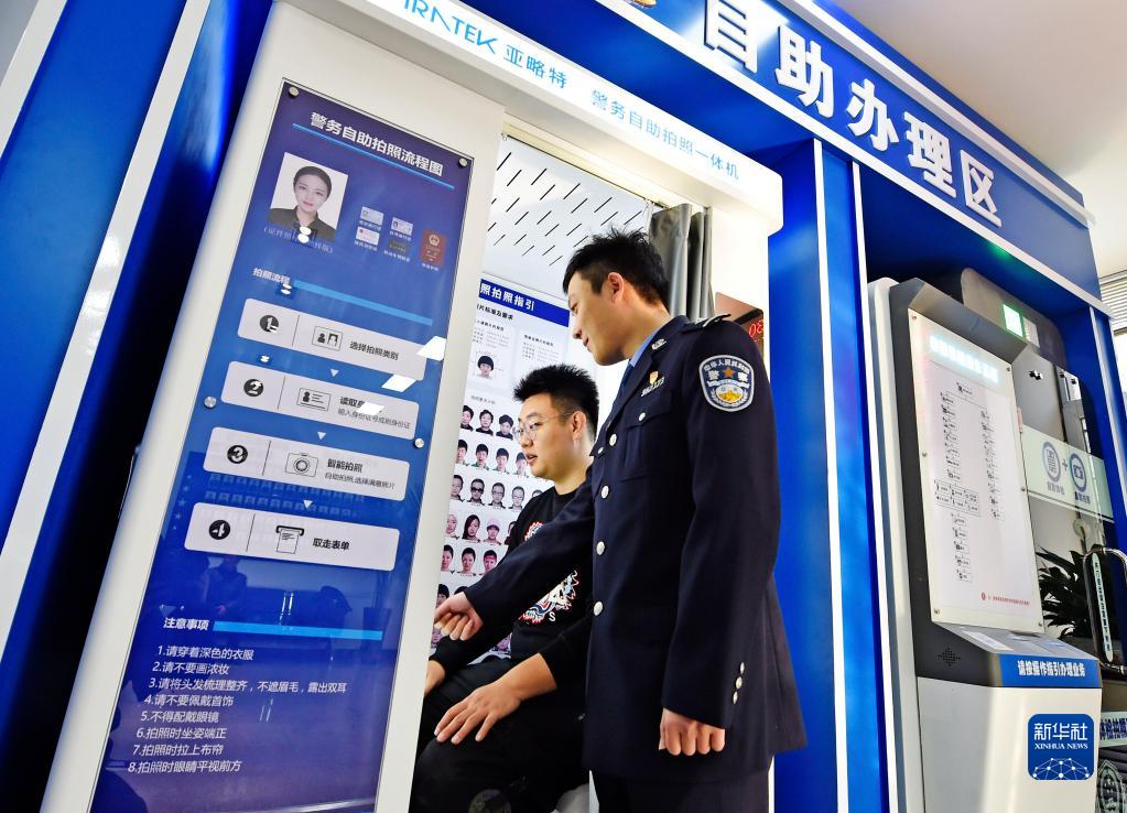 在遼寧省本溪市公安局北地派出所民警指導下,市民通過自助體檢機完成機動車駕駛人檢測項目(2021年12月10日攝)。新華社發