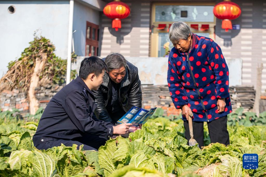 江蘇省泰州市海陵區蘇陳派出所民警在蘇陳社區田間地頭向農戶進行普法宣傳(2021年12月4日攝)。新華社發(湯德宏 攝)