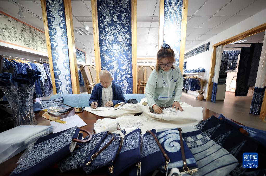 2022年4月7日,在貴州省黔東南苗族侗族自治州丹寨縣寧航蠟染非遺工坊,服飾設計師在設計蠟染產品。新華社發(黃曉海 攝)