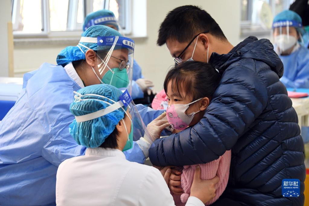 在北京市海淀區學院路街道新冠疫苗接種點,醫護人員為一名小朋友接種新冠疫苗(2021年11月13日攝)。新華社記者 任超 攝