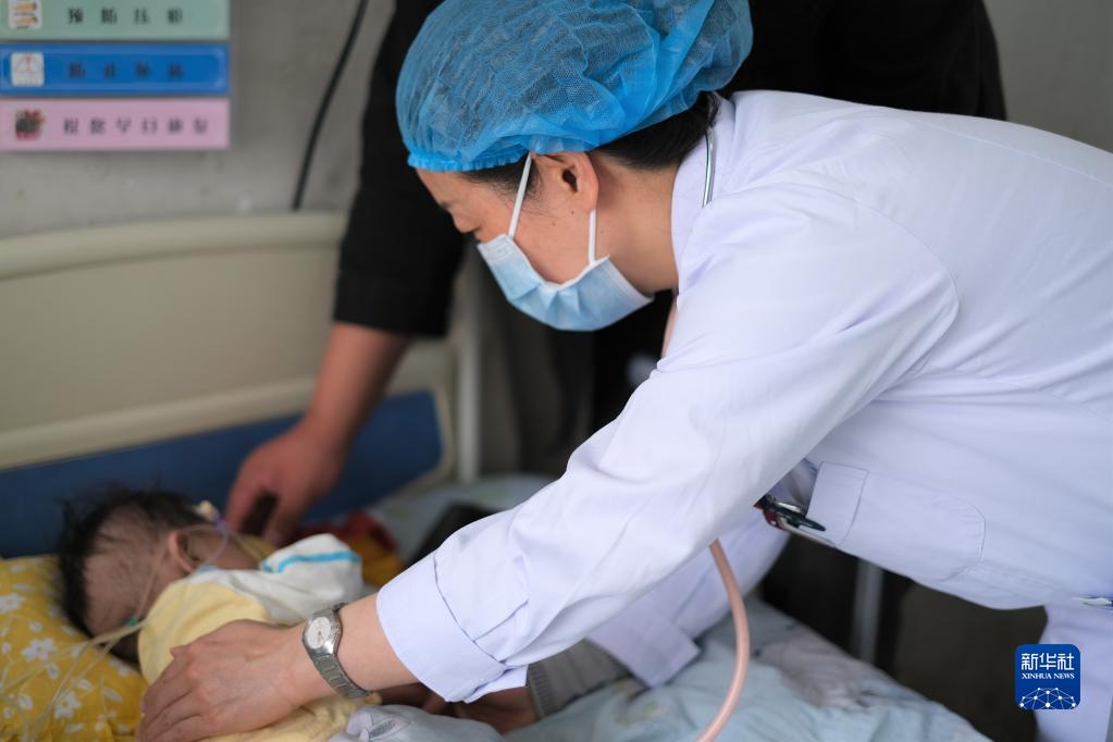 青海省婦女兒童醫院醫生、青南支醫隊員孫敬在青海省玉樹藏族自治州人民醫院給患者檢查身體(2022年4月25日攝)。新華社記者 韓方方 攝