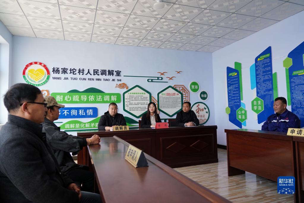 律師甄彩麗(中)在河北唐山灤州市茨榆坨鎮楊家坨村人民調解室內為群眾解答法律問題(2021年4月18日攝)。新華社記者 牟宇 攝