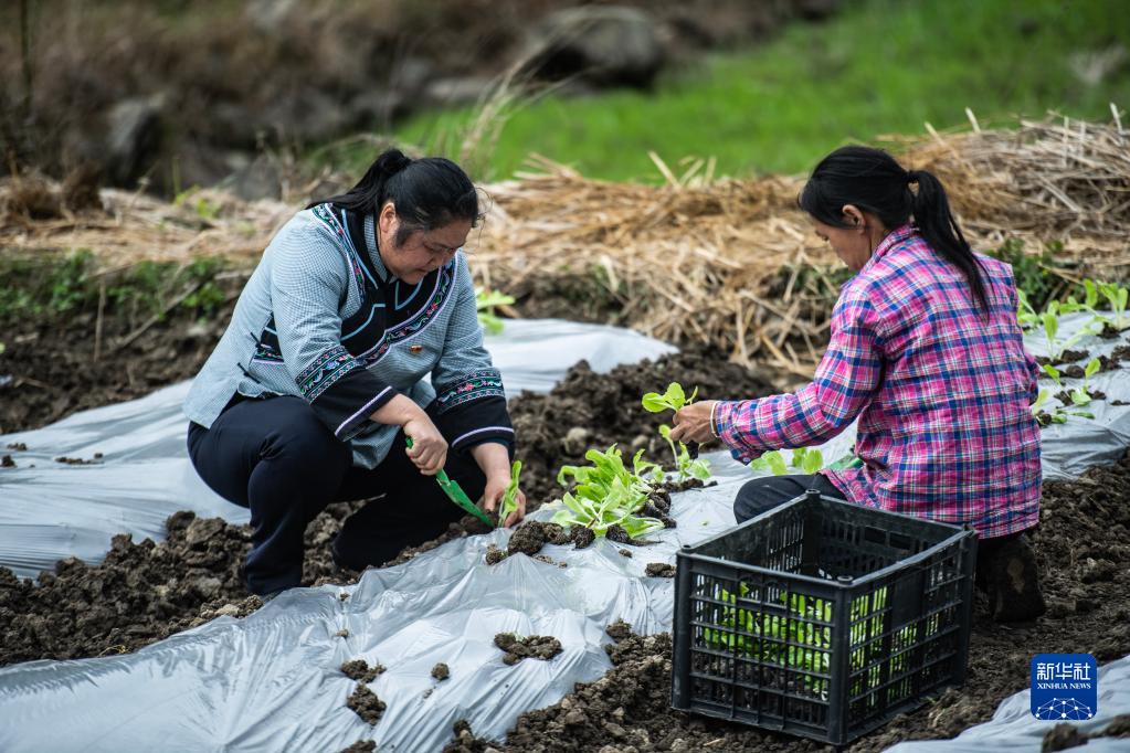 在貴州省羅甸縣沫陽鎮麻懷村,鄧迎香(左)和村民一起種植白菜苗(2020年3月9日攝)。新華社記者 陶亮 攝
