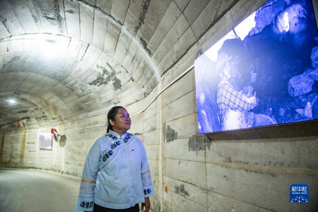 在貴州省羅甸縣沫陽鎮麻懷村,鄧迎香在隧道內看著過去的照片,回憶開山挖洞的情景(2020年8月31日攝)。新華社記者 陶亮 攝