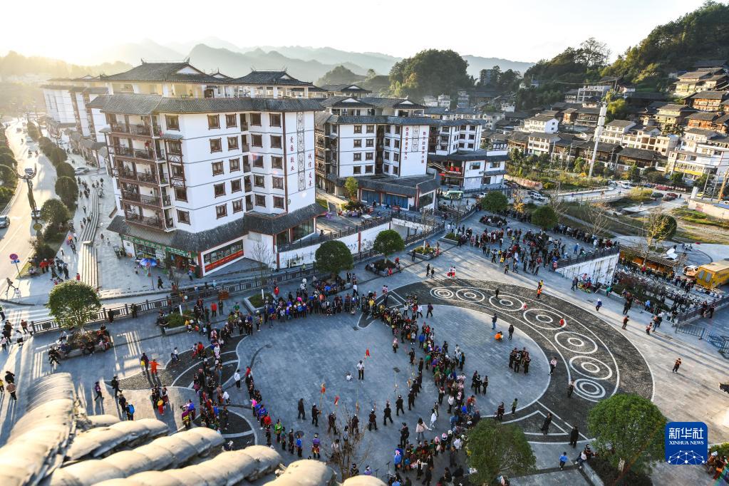在貴州省雷山縣龍頭街道一處易地扶貧搬遷安置點,村民和游客在苗年活動中跳蘆笙舞(2020年11月19日攝)。新華社記者 楊文斌 攝