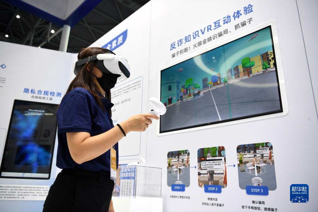 9月4日,一家參展企業代表在2022年國家網絡安全宣傳周網絡安全博覽會上演示反詐知識VR互動體驗項目。新華社記者 劉軍喜 攝
