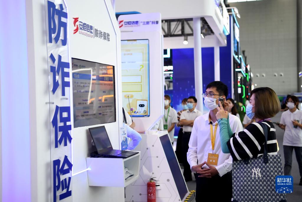 9月5日,參展人員在2022年國家網絡安全宣傳周網絡安全博覽會上介紹防詐保險。新華社記者 劉軍喜 攝