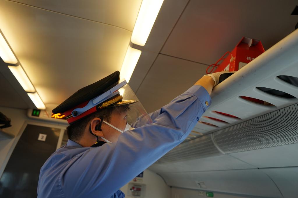 每逢節假日,列車的客流量大增,對于黃卓智來說,工作需要更加認真和仔細。清晨7時43分,列車緩緩駛出大同南站,作為列車長,黃卓智的工作一分鐘都沒有停下來,他要負責車上大小事務,包括檢查設備安全、巡視車廂、驗收保潔工作、到站后引導乘客下車……