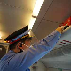 黃卓智在整理行李架上乘客的行李。新華社記者 王怡靜 攝