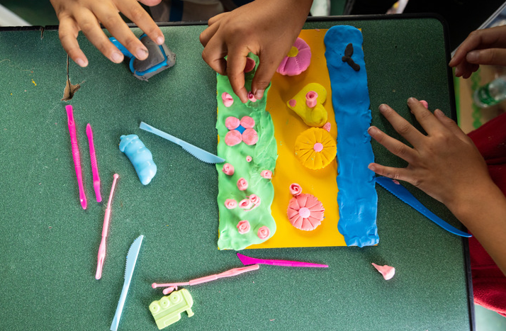 9月10日,在瀘定二中臨時安置點的“帳篷課堂”里,孩子們用橡皮泥制作創意“月餅”。新華社記者 沈伯韓 攝