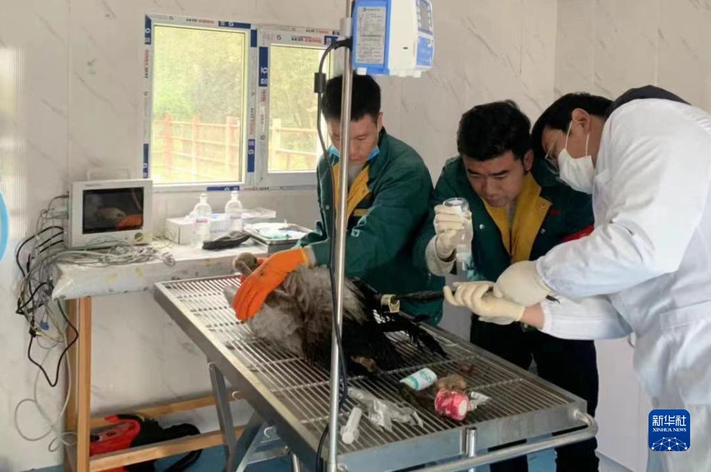 2020年秋季,西寧野生動物園的工作人員在救助落單的黑頸鶴“小灰”。新華社發(西寧野生動物園供圖)