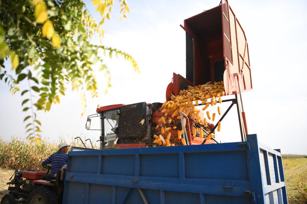 9月22日,玉米收割機將收獲的玉米倒入小四輪拖拉機車斗內。新華社記者張浩然 攝