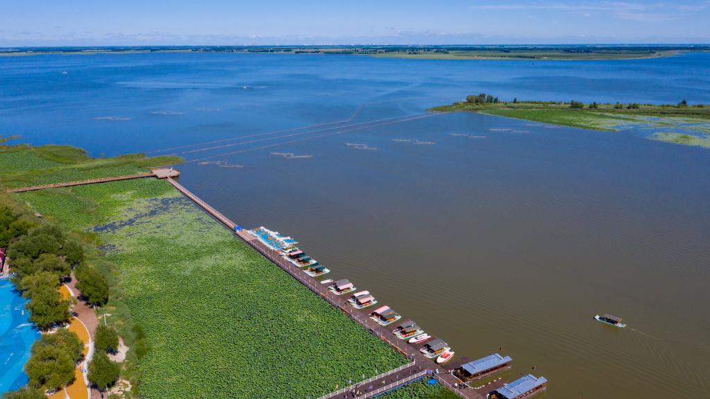 2020年7月20日,游人乘船游覽查干湖(無人機照片)。新華社記者 張楠 攝