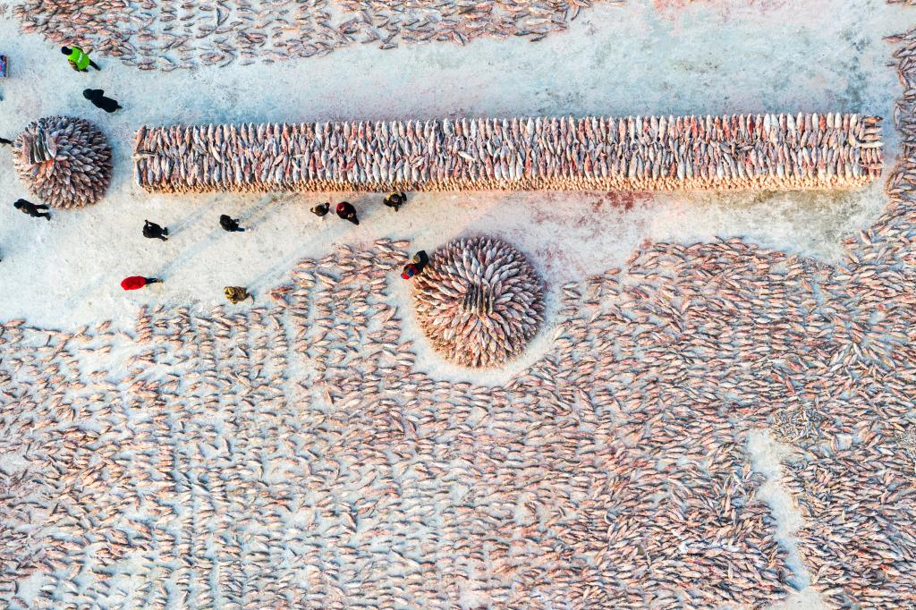 2019年12月27日,在查干湖漁場超市,消費者選購查干湖魚(無人機拍攝)。新華社記者 張楠 攝