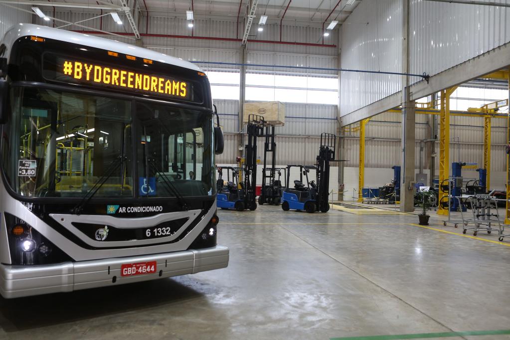 這是2017年4月6日在巴西坎皮納斯市的比亞迪工廠拍攝的電動大巴車。(新華社發)