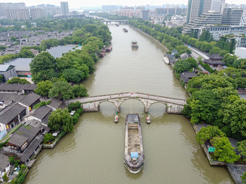 5月27日,一艘貨船駛過京杭大運河南端標志建筑杭州拱宸橋。(無人機照片)新華社記者江漢 攝