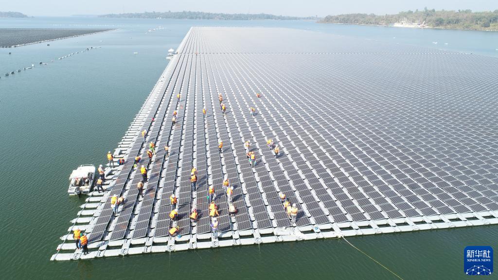 2021年1月23日,施工人員檢查中泰兩國聯合承建的泰國烏汶府詩琳通大壩綜合浮體光伏項目的太陽能板安裝情況。新華社發(泰國國家電力局項目組供圖)