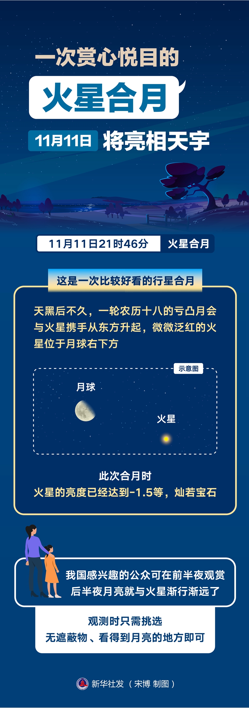 新華社天津11月9日電(記者周潤?。┪⑽⒎杭t的火星與皎潔明亮的月球近距離“相遇”會擦出怎樣的火花?天文科普專家介紹,11月11日晚,一次賞心悅目的火星合月將亮相天宇,屆時只要天氣晴好,我國感興趣的公眾憑借肉眼就能目睹這幕浪漫的“星月童話”。