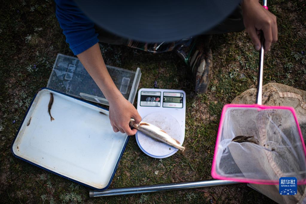 長江科學院科考隊員劉晗在長江南源當曲對采集的一尾小頭裸裂尻魚稱重(2022年7月25日攝)。 新華社記者 肖藝九 攝
