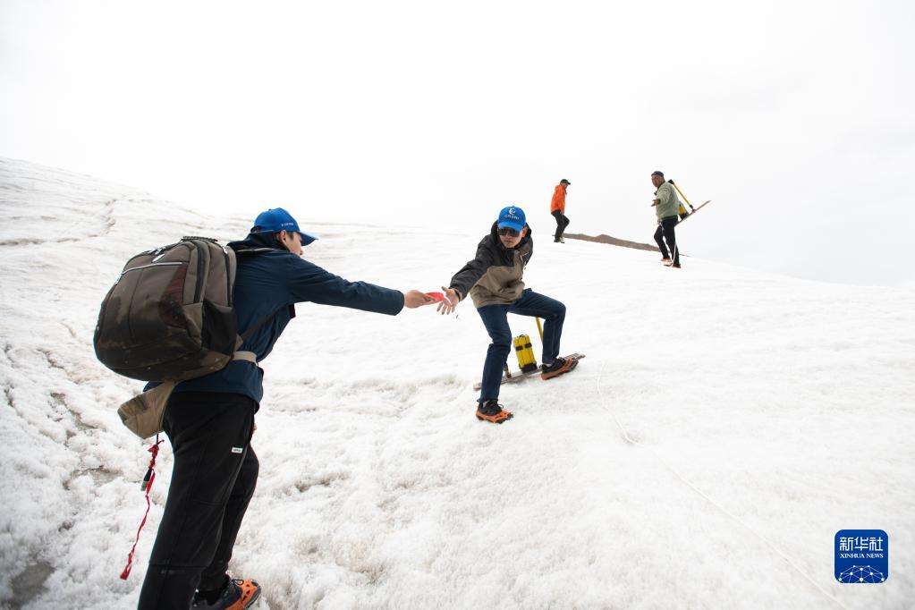 在長江源各拉丹冬雪山,來自長江科學院的科考隊員范越(左二)在搬運探測設備(2022年7月28日攝)。 新華社記者 肖藝九 攝