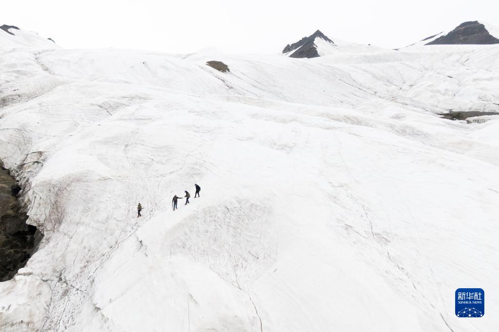 來自長江科學院的科考隊員在各拉丹冬雪山上(2022年7月28日攝,無人機照片)。 新華社記者 肖藝九 攝