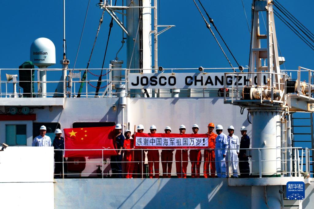 被護船舶向中國海軍第41批護航編隊展示國旗和寫有“感謝中國海軍祖國萬歲”字樣的橫幅(8月5日攝)。新華社發(向黎鳴 攝)