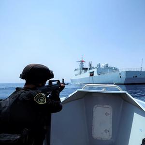 中國海軍第41批護航編隊南通艦戰士值更時,密切關注商船安全(8月5日攝)。新華社發(溫子東 攝)