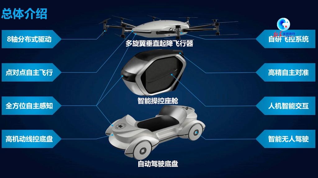 據介紹,該飛行汽車具有充分發揮近地飛行器與地面行駛底盤各自優點、智慧交通優勢、最優化能量效益的特點,可實現人員、貨物空地轉運的無縫銜接,具備更大的靈活性。通過陸空協同精確感知定位、智能決策規劃和自動引導對接等技術實現模塊組合重構,可切換陸空不同行駛模式。