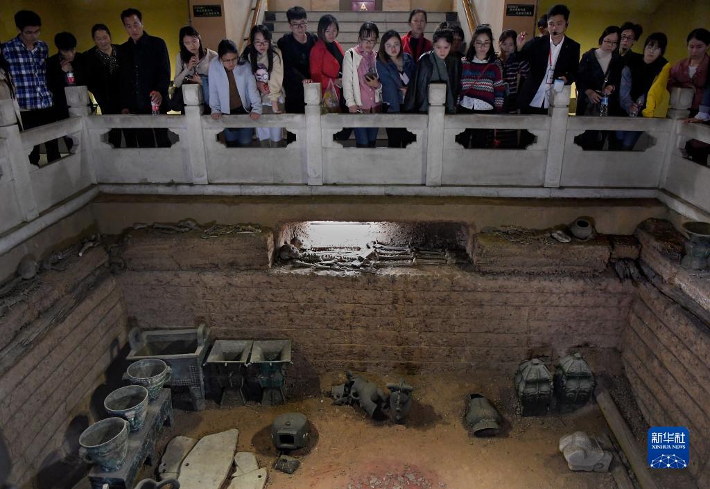 游客在河南安陽殷墟宮殿宗廟遺址內的婦好墓參觀(2018年10月12日攝)。 新華社記者 李安 攝