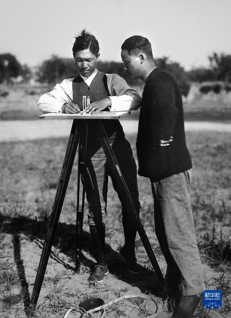 董作賓(右)和李春昱在殷墟第一次發掘中測量繪圖(資料照片)。 新華社發