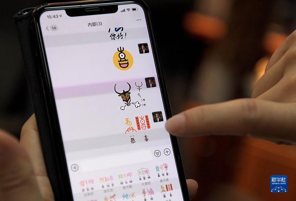 清華大學美術學院教授陳楠在位于清華大學的工作室內展示他設計發布的甲骨文表情包(2019年9月24日攝)。 新華社記者 李安 攝