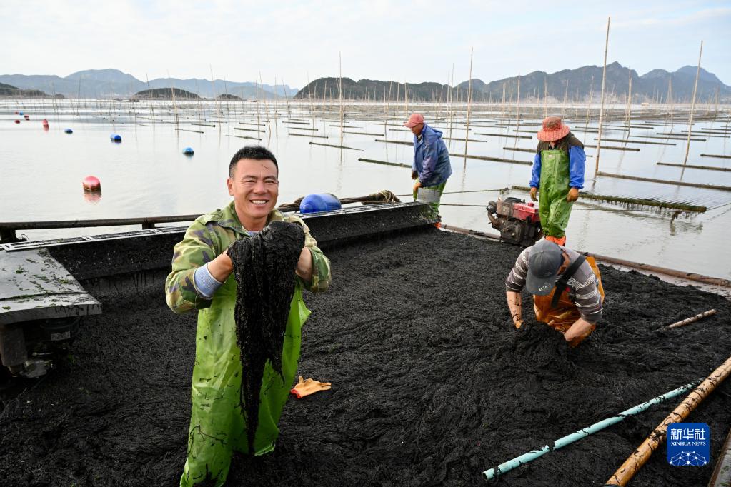 在福建寧德霞浦縣松山街道沙塘街村海邊,漁民林瑞波展示收獲的頭水紫菜(2022年10月21日攝)。新華社記者 姜克紅 攝