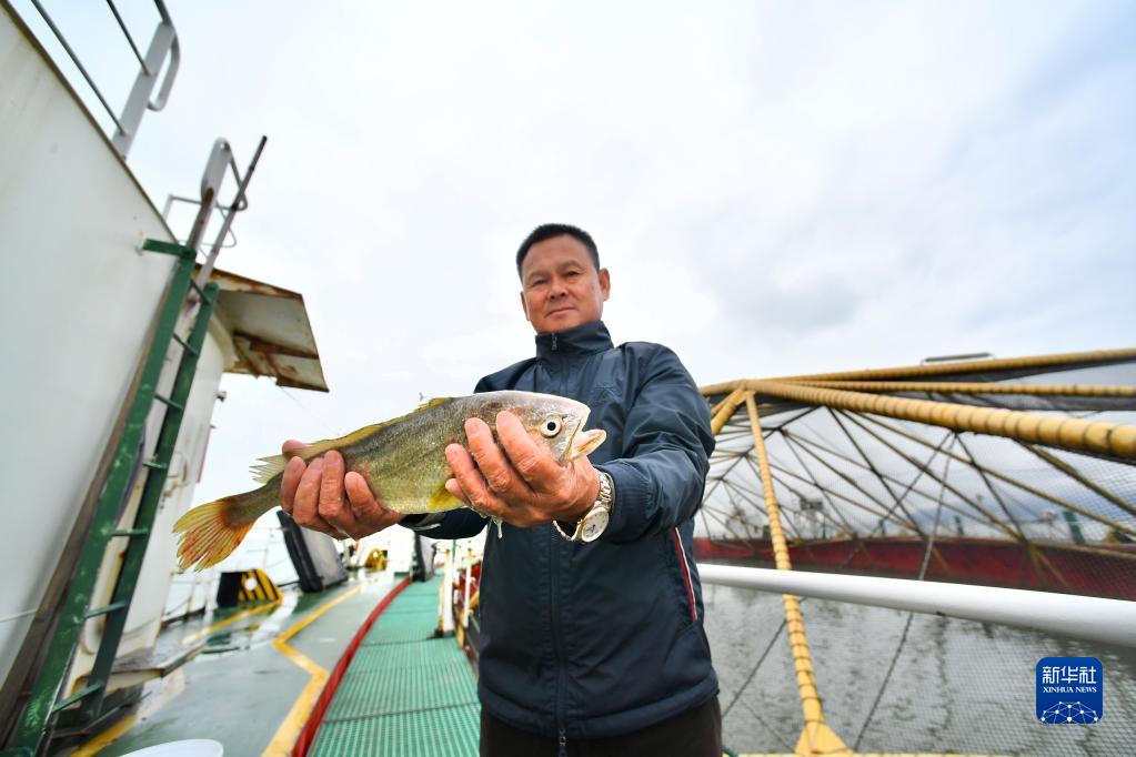在福建福州連江縣定海灣內的“振漁1號”現代化深海養殖平臺上,福州力美水產科技有限公司總經理許福安展示養殖的大黃魚(2022年11月15日攝)。新華社記者 姜克紅 攝